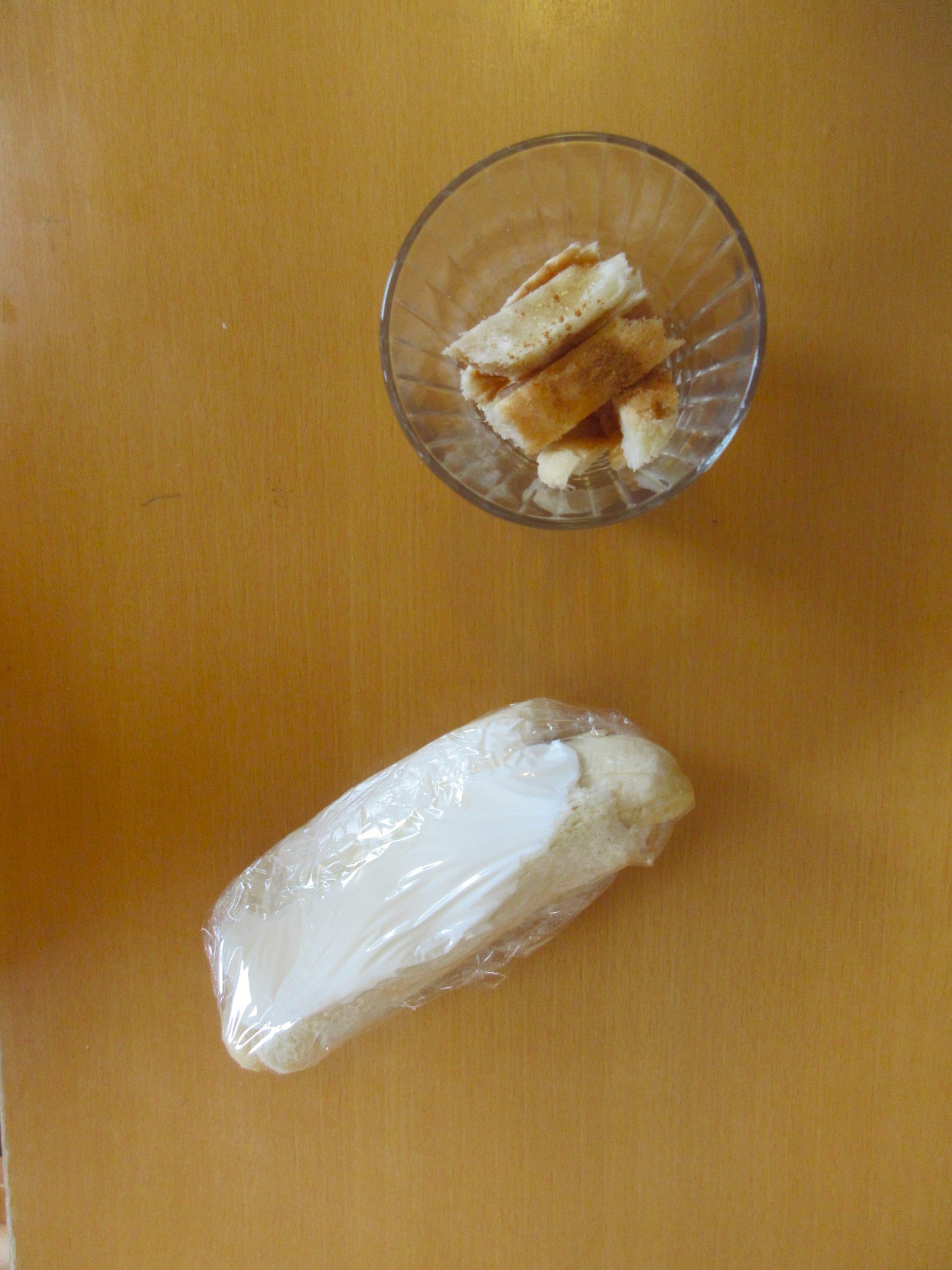 食パンを綿棒で転がして潰し、クリームとバナナを置いてラップで巻きました。