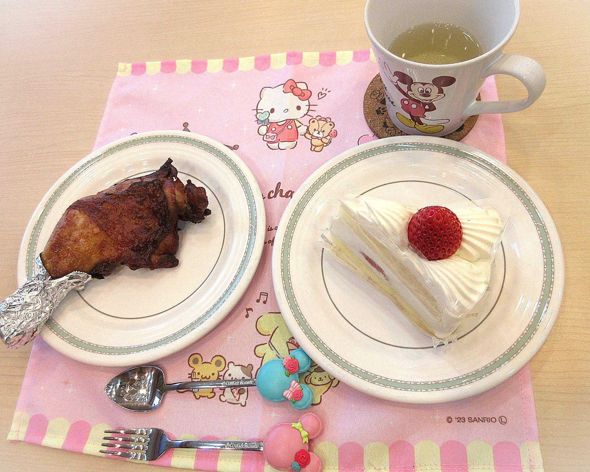 クリスマス会当日は、苺のショートケーキとお肉屋さんの骨付きチキンソテーをテーブルに並べ、シャンメリーで乾杯しました。