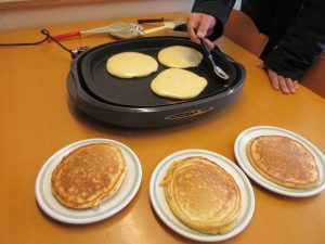 生地作りは、粉を入れる、水を計量する、生地を混ぜる、ホットプレートで焼く等の